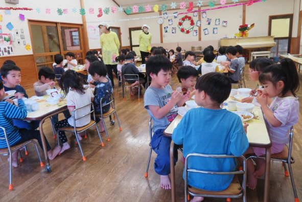 また、クリスマス前には、“らくようパーティー” を行いました。パーティーの前日、会場には子どもたちの作品があちこちにあふれました。当日のにぎやかな会場には、子どもたちの大好きなメニューが並びました。給食室の先生によるオープンキッチンに目を輝かせ、縦割りグループのお友だちとバイキング給食を楽しみました。乳児クラスではサンタに扮した職員と一緒に、パーティーメニューを頬張っていましたよ。