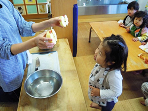 少しずつ味覚が発達し、食材の味の好みがはっきりとしてくる1歳児クラスの子どもたち。今回は、給食室の先生にりんごの皮むきを見せてもらう「ルッキング」を行いました。