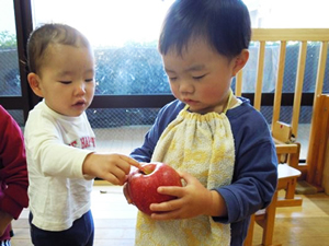 まずは、りんごを一人ずつ手に取り、甘い香りをかいだり、手に持った時の重さや感触を確かめたりしながら、りんごに興味津々の子どもたち。「おいしい(香り)!」と言葉で表現したり、じっと見つめたりと、それぞれの感じ方で楽しんでいました。